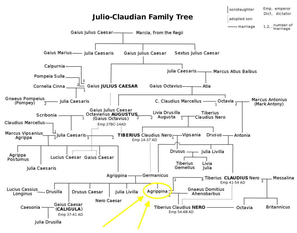Agrippina the Younger was a Roman empress and the fourth wife (and niece) of Emperor Claudius. Cast in royal purple, she was the sister of Caligula, the third emperor, and the great-niece of Tiberius, the second emperor. However, her most significant direct relation was her great-grandfather, the first emperor, the “Divine Augustus,” who established the Julio-Claudian dynasty that her son, Emperor Nero, would ultimately bring to an ignominious end.